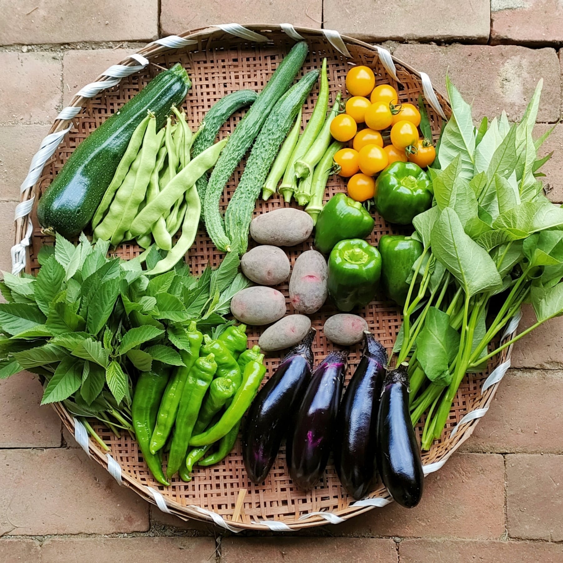 夏・ズッキーニ、ししとう(万願寺とうがらし)、ナス(くろまさり)、四葉キュウリ、モロヘイヤ、つるむらさき、モロッコいんげん、ピーマン、ミニトマト、みょうが、空心菜、バジル、ジャガイモ(キタアカリ、)、・・・など